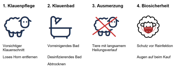 Für den Klauenschnitt, das Klauenbad und das Abtrocknen nach dem Bad sind befestigte Plätze notwendig. Für eine Sanierung während der Stallhaltungsperiode ist der Stall zu Sanierungsbeginn vollständig auszumisten, danach zu reinigen und bevorzugt zu desinfizieren. Nach den Folgebädern kann der Stall jeweils frisch eingestreut werden. Kalkeinstreu kann als zusätzliche Massnahme verwendet werden.