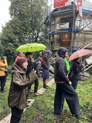 Wieso gerade jetzt kein einziger Sonnenstrahl, nur Nässe von oben? Das zweijährlich stattfindende IBK-Format der Künstler:innenbegegnung, das dieses Jahr die beiden Appenzeller Kantone gemeinsam verantworten, startete die nicht öffentlichen Begegnungstage im Museum Heiden im Trockenen. 18 Kulturschaffende aus verschiedenen Sparten folgten den Ausführungen von Historiker David Aragai und Museumsleiter Marcel Zünd zur Geschichte des Kurorts Heiden und der Sammlung des Museums. In Lutzenberg lag der Fokus der Ausserrhoder Denkmalpflegerin Vreni Härdi auf der Textilgeschichte und ihren Auswirkungen auf bauliche Besonderheiten. Über eine steile Gerüsttreppe gelangte die Gruppe zum lange Jahre dem Verfall preisgegebenen Jagdpavillon mit Schlachtenmalereien und konnte diesen besichtigen.
