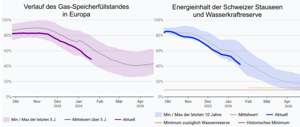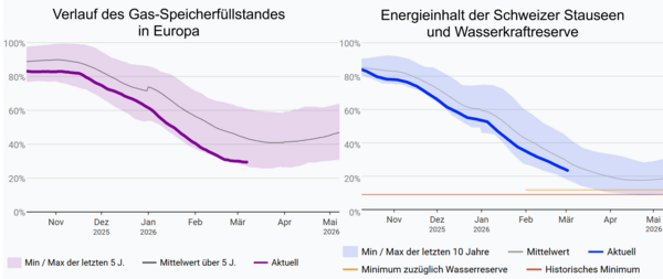 Sowohl der Füllstand der Schweizer Speicherseen als auch die Gasspeicherstände in Europa liegen deutlich unter dem langjährigen Mittel. Beides spielt für die Stromversorgungssicherheit der Schweiz eine entscheidende Rolle.