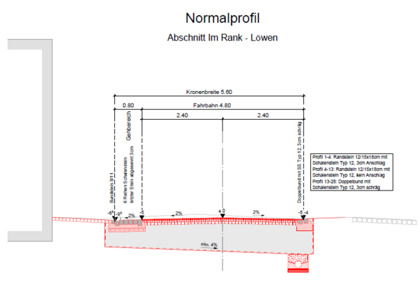 Im selben Zusammenhang soll die bestehende Kantonsstrasse zwischen Feuerwehrdepot und dem Knoten Im Rank instandgestellt werden. Es werden Randabschlüsse und Beläge ersetzt.