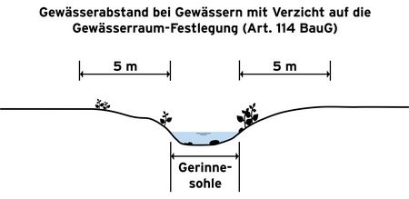 Bei Verzicht auf die Festlegung des Gewässerraums gilt gemäss Baugesetz (BauG) ein kantonaler Bauabstand entlang von Bächen und Flüssen. Dieser dient der Sicherstellung des zukünftigen Gewässerunterhalts sowie der minimalen ökologischen Funktionen und beträgt 5 m beidseitig ab Gewässer- bzw. Eindolungsrand.