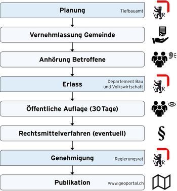 Das Verfahren zur Festlegung des Gewässerraums ist im Baugesetz geregelt. Die zur Festlegung des Gewässerraums notwendigen Planungsarbeiten liegen in der Zuständigkeit des Tiefbauamts. Nach Anhörung der betroffenen Kreise einschliesslich der Gemeinden werden die Gewässerraumlinien durch das Departement Bau und Volkswirtschaft erlassen und während 30 Tagen öffentlich aufgelegt. Sie treten mit der rechtskräftigen Genehmigung durch den Regierungsrat in Kraft. Die Publikation erfolgt anschliessend im kantonalen Geoportal (www.geoportal.ch).