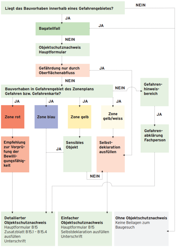 Bei Bauvorhaben in Gefahrengebieten sind wirksame und wirtschaftliche Massnahmen zum Schutz von Menschen und Sachwerten umzusetzen. Ein Objektschutznachweis wird als integrierender Bestandteil der Baugesuchseingabe verlangt (Art. 115a Abs. 2 BauG; bGS 721.1). Der Umfang der einzureichenden Unterlagen richtet sich nach der Gefahrenexposition eines Bauvorhabens. Weitere Informationen finden Sie im Leitfaden Objektschutznachweis (siehe «Dokumente»).