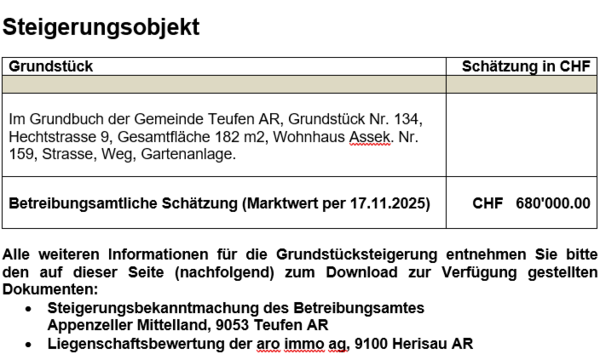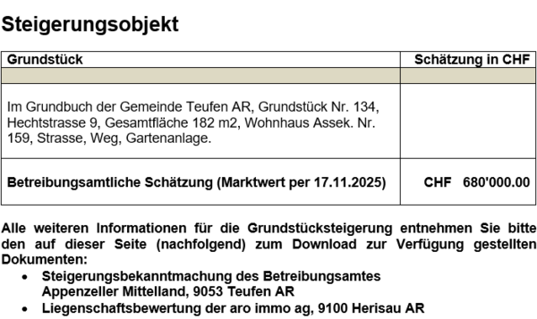 Grundstücksteigerung vom Donnerstag, 26. März 2026, um 14.00 Uhr, im Lindensaal, Zeughausstrasse 4, 9053 Teufen AR - Appenzell Ausserrhoden