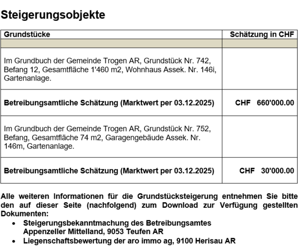 Grundstücksteigerung vom Dienstag, 21. April 2026, um 14.00 Uhr, im Lindensaal, Zeughausstrasse 4, 9053 Teufen AR - Appenzell Ausserrhoden