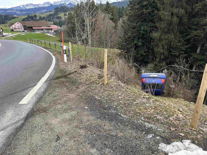 Kurz vor 14.30 Uhr lenkte ein 20-jähriger Mann seinen Personenwagen von Schwellbrunn in Richtung Eisigeli. In der scharfen Linkskurve im Bereich Rotschwendi verlor er die Herrschaft über sein Fahrzeug und fuhr über den rechten Fahrbahnrand ins abfallende Bord. In der Folge überschlug sich das Auto und kam auf dem Dach zum Liegen. Der Lenker wurde nicht verletzt, sein 19-jähriger Beifahrer brach sich beim Unfall die Hand. Am Fahrzeug entstand ein Sachschaden von mehreren Tausend Franken. Durch die ausgerückten Polizisten wurden beim Lenker Alkoholsymptome festgestellt. Ein durchgeführter Atemlufttest ergab ein positives Ergebnis. Der Führerschein wurde dem 20-jährigen zu Handen der Administrativbehörde auf der Stelle abgenommen. Der Beifahrer wurde durch eine Patrouille der Kantonspolizei AR ins Spital gebracht. Beim Fahrzeug liefen Flüssigkeiten aus. Zum Auffangen und Entsorgen der Flüssigkeiten wurde die Feuerwehr Schwellbrunn aufgeboten. Eine Umweltgefährdung bestand keine.