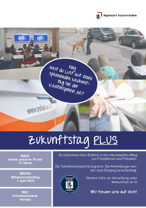 Am Mittwochnachmittag, 1. April 2026, bietet die Kantonspolizei Appenzell Ausserrhoden Kindern im Alter von 10 bis 13 Jahren einen Einblick in den interessanten Alltag von Polizistinnen und Polizisten.