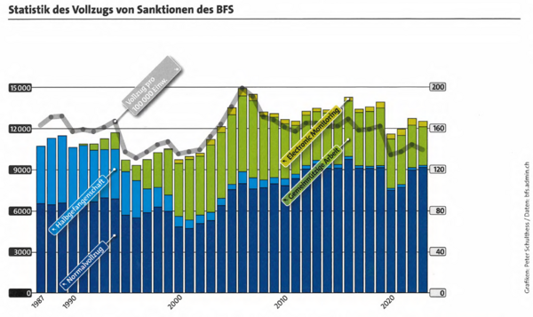 Das Electronic Monitoring (EM) kann höchstens die Halbgefangenschaft ersetzen. Dies ist eine Haftform, die kaum noch gebraucht wird. Den in der Strafanstalt angebotenen offenen Strafvollzug braucht es deshalb nach wie vor. Eine gewisse Zunahme der Fallzahlen hat sich im Jahr 2024 ergeben. Dies ist die Folge eines Bundesgerichtsentscheids, der die Anordnungskriterien ausgeweitet hat. Der Bundesrat hat im Rahmen eines Postulats den Vollzug von EM evaluiert und ein positives Fazit gezogen (Postulat 16.3632, Bericht vom August 2025). Trotzdem bleibt EM mit 2.5% Anteil an den Vollzugstagen (Stand 2023) eine Randerscheinung. Die nachstehende Grafik zeigt, dass die Gemeinnützige Arbeit stärker gefragt ist als Alternative zum Strafvollzug als die elektronische Überwachung: