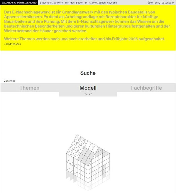 Das E-Nachschlagewerk ist ein Grundlagenwerk mit den typischen Baudetails von Appenzellerhäusern. Es dient als Arbeitsgrundlage mit Rezeptcharakter für künftige Bauarbeiten und ihre Planung. Mit dem E-Nachschlagewerk können das Wissen um die bautechnischen Besonderheiten und deren kulturellen Hintergründe festgehalten und der Weiterbestand der Häuser gesichert werden.